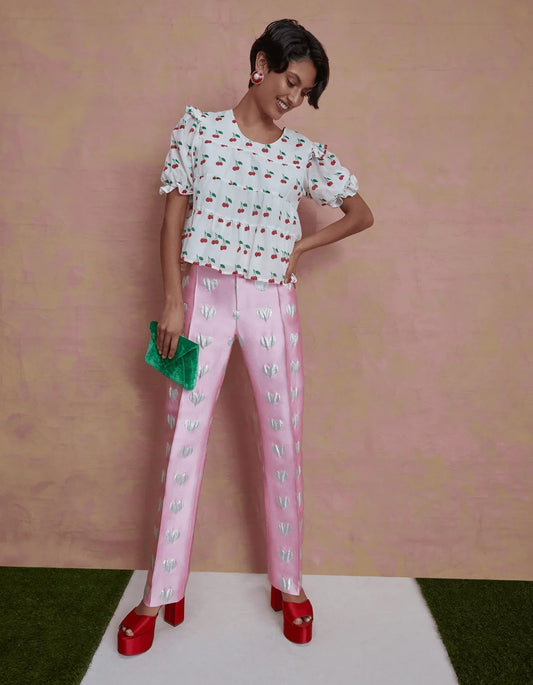 Lisou Hetty Pink Heart Print Silk Jacquard Trousers